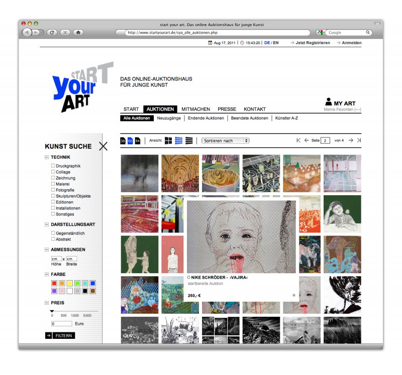 Raum für Kunst zu bieten ist das Ziel des neuen Online-Auktionshauses start your art, in dem junge Künstler ihre Werke unkompliziert einer breiten Öffentlichkeit präsentieren und meistbietend versteig ...Auftraggeber