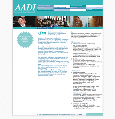 Hoher Informationsgehalt und zeitgemäße, attraktive Gestaltung sowie flexible und kommunikationsintensivere Nutzungsmöglichkeiten zeichnen den neuen Internetauftritt der Arbeitsgemeinschaft Aesthetik und Dermatologische Institute e.V. (www.aadi.de) aus. Inhaltlich wurde die Homepage der heutigen Philosophie, dem zukunftsweisenden Profil und dem attraktiven Leistungsangebot der AADI angepasst. Darüber hinaus wurden neue Nutzungs- Kommunikationsmöglichkeiten im Zusammenspiel der AADI mit ihren Mitgliedern, den Industrie- und Medienpartnern sowie insbesondere den Patienten und sonstigen Nutzern geschaffen.Für die Neugestaltung und die grafische Modernisierung der Webseite, des AADI Logos und der Geschäftsausstattung ist die Dipl. Designerin Nina Ruthe-Klein vom DESIGN STUDIO NIRUK verantwortlich. (www.niruk.de)