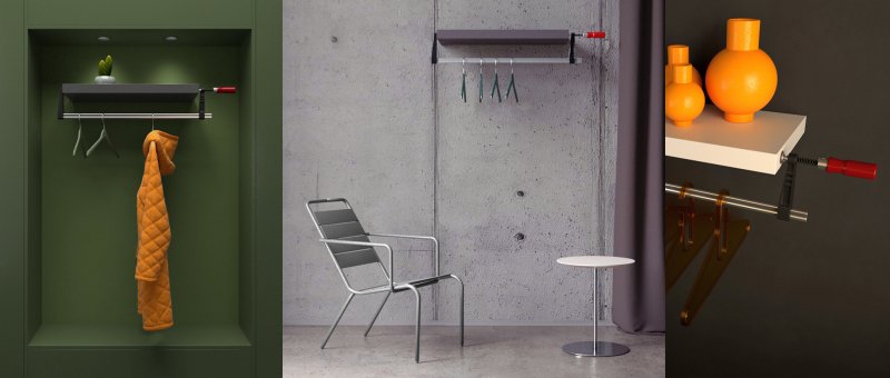 Die Schraubzwinge umgreift das Garderobenbrett und wird zur Kleiderstange. Der beste Platz für Jacken, Mäntel und anderes. Smart und elegant.