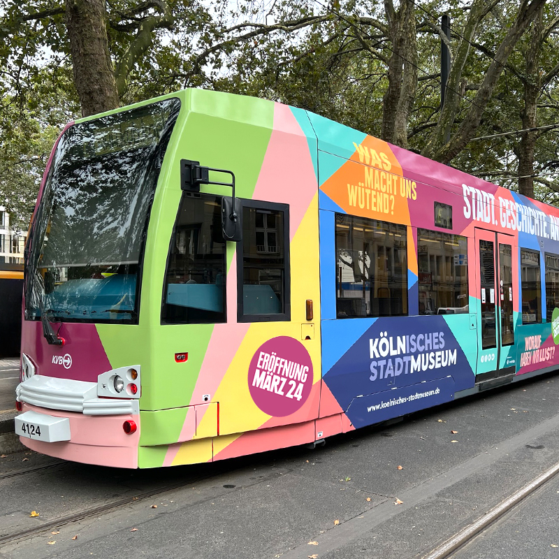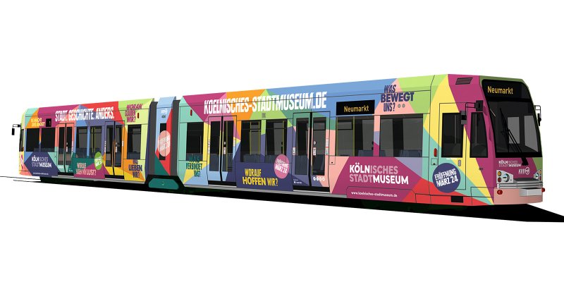 Rechtzeitig zur Eröffnung am neuen Ort wirbt eine KVB-Kulturbahn für das Kölnische Stadtmuseum. Die in kräftigen Farben gestaltete Bahn zeigt sich dabei ebenso bunt und vielfältig wie das Museum, das ...Auftraggeber