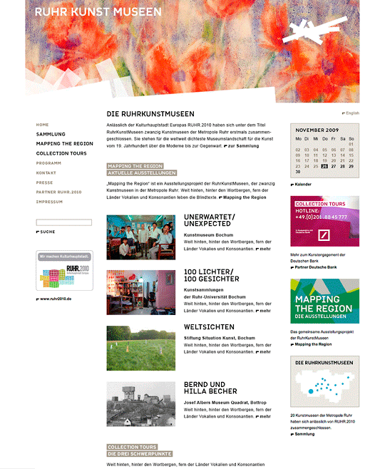 20 Kunstmuseen aus 15 Städten des Ruhrgebiets haben sich 2010 zu den RuhrKunstMuseen zusammengeschlossen. Im Rahmen der Kulturhauptstadt Europas RUHR.2010 gibt es mit dem Ausstellungsprojekt „Mapping ...Auftraggeber