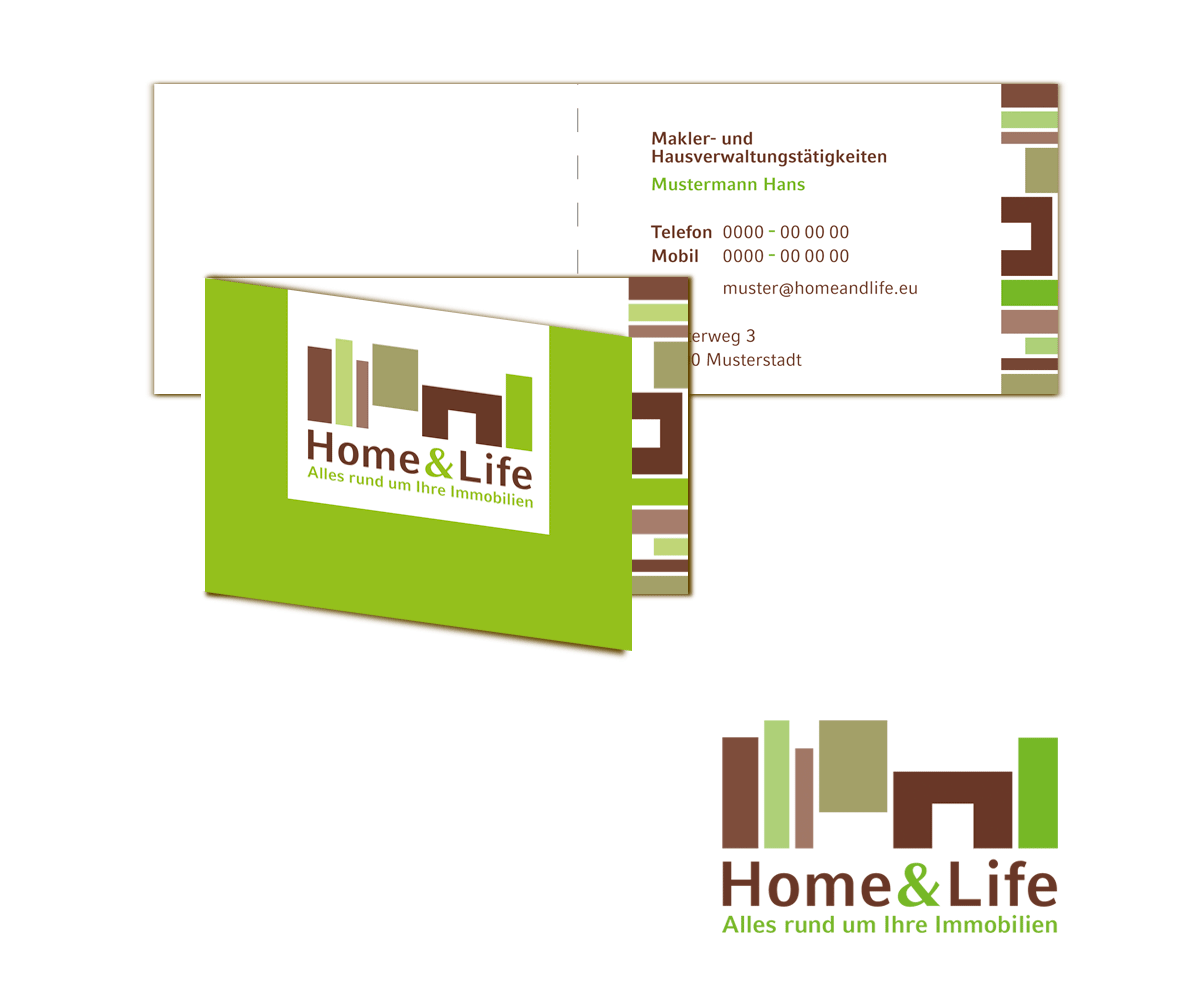 Logoentwicklung für den Immobilienmakler "HOME&LIFE",Gestaltung der Visitenkarten sowie Layout der Website.