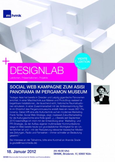Yadegar Asisi hat bereits in Dresden und Leipzig gigantische Panoramen errichtet. In einer Mischtechnik aus Malerei und PhotoShop realisiert er begehbare Installationen, die täuschend echt, historische Raumsituationen simulieren. In einer Zusammenarbeit mit der Antikensammlung Berlin im Ehrenhof des Pergamonmuseums erstellt Asisi ein neues 360°-Panorama. Dabei trifft eine alte Kulturtechnik auf ein modernes Marketing.Frank Tentler, Social Web Stratege, zeigt, inwieweit Zukunftsmarketing für die Kulturgeschichte eine Rolle spielt: „(...) Bereits seit September 2010 beschäftige ich mich mit der Entwicklung einer Marketing- und PR-Strategie, da der Aufbau eigener multimedialer Kommunikationswege im Web bereits heute von grundsätzlicher Wichtigkeit für ein Unternehmen ist und – mit der Reduzierung relevanter klassischer Medien wie Zeitungen, Radio und Fernsehen – immer schneller an Bedeutung gewinnt.“