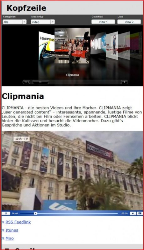 Features:Darstellung der Video und AudioPodcasts als Coverflow oder Liste, Filterung nach Kategorie und Medienart, Extraktion der benötigten Daten aus dem gerade aktiven RSS-Feed, Auswahl des benötigt ...Auftraggeber