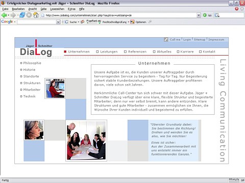 Unternehmens und Dienstleistungs- Präsentation für die Dialogmarketing-Agentur Jäger + Schmitter DiaLog. Die Bereiche Karriere und Aktuell werden vom Kunden via Redaktionssystem selbst gepflegt. ...Auftraggeber
