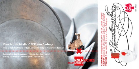 Frischer Blick auf die Exponate des Stadtmuseums: Werbekarte »Dies ist nicht die Oper von Sydney!« mit Gutschein, dreisprachig.