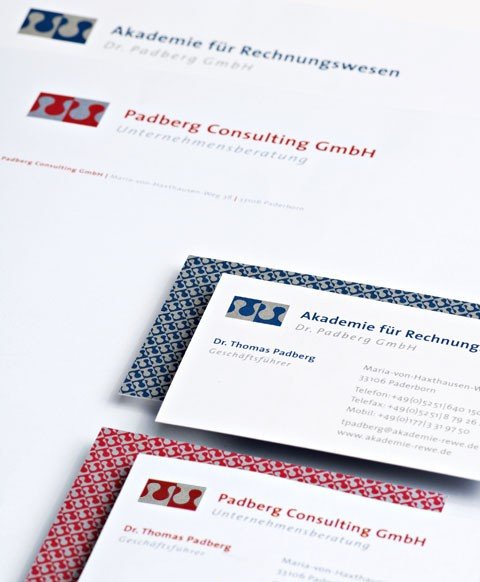 Die zwei Sonderfarben Blau und Rot werden jeweils mit Silber kombiniert und geben dem Erscheinungsbild eine hochwertige Note. Das Familienwappen der Padbergs dient als Grundlage für das Logo.